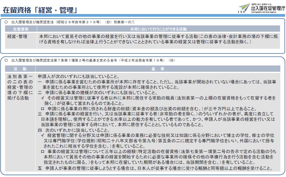 ☝出入国在留管理庁には在留資格「経営・管理」について、上記のように定義されています。昔は「投資・経営ビザ」と言われていましたが法改正で呼び名が変わっています。