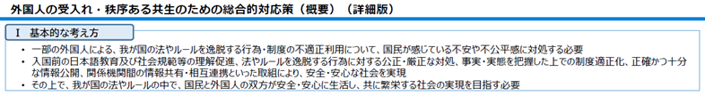 部分外国人不遵守法律和规则,偏离了轨道,对制度进行滥用,让日本国民深感焦虑并且觉得很不公平,因此非常有必要贯彻:在外国人入境前就督促他们理解日语和社会规范、对违法违规行为进行处理,在掌握事实的基础上让制度能够被妥善运用,从而最终实现让外国人和国民双方皆能安全·安心地生活,共创社会繁荣。